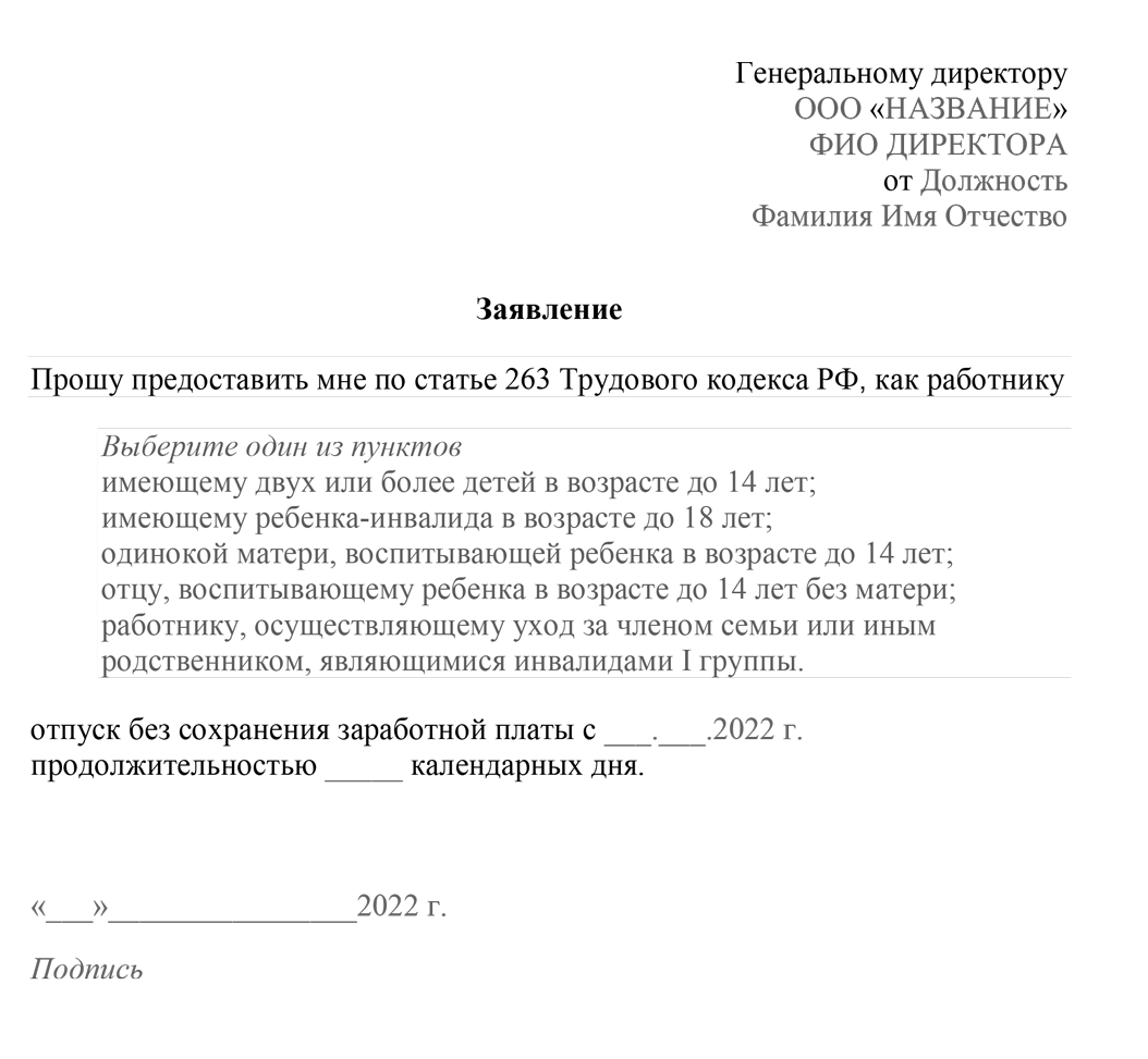 Используется:Как основание для оформления работнику отпуска без сохранения заработной платы