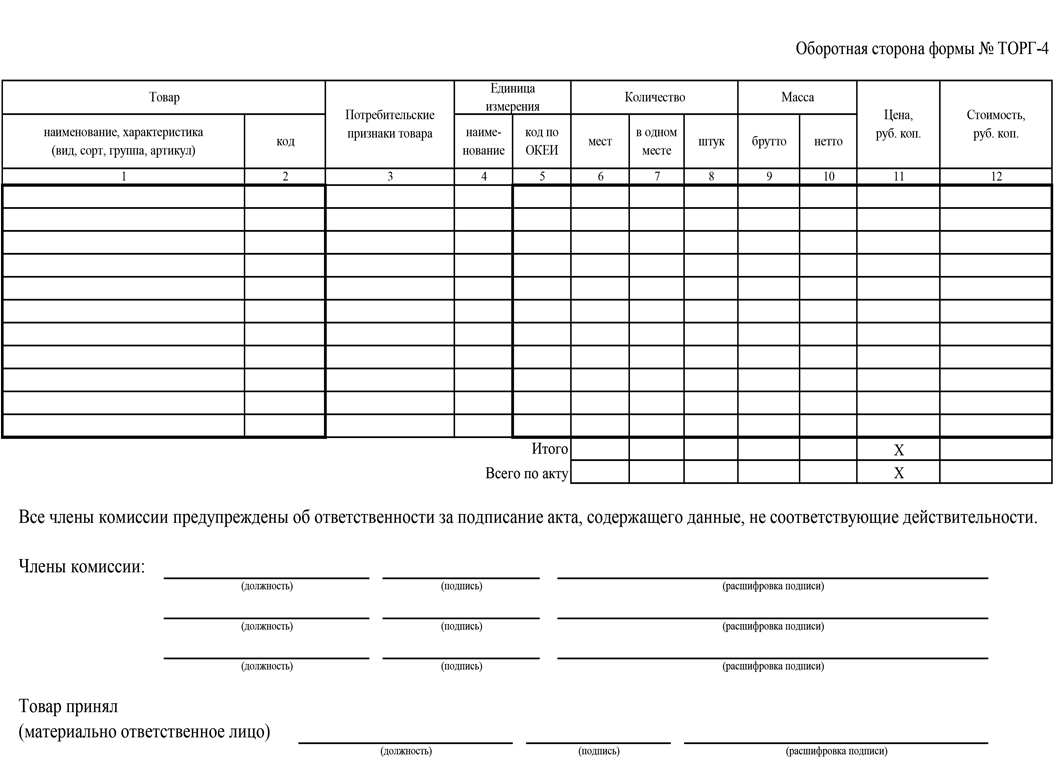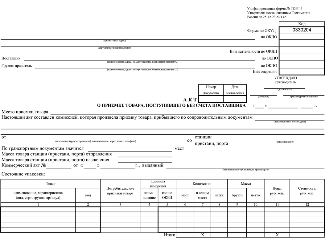 Акт о приемке товара, поступившего без счета поставщика (форма № ТОРГ-4)