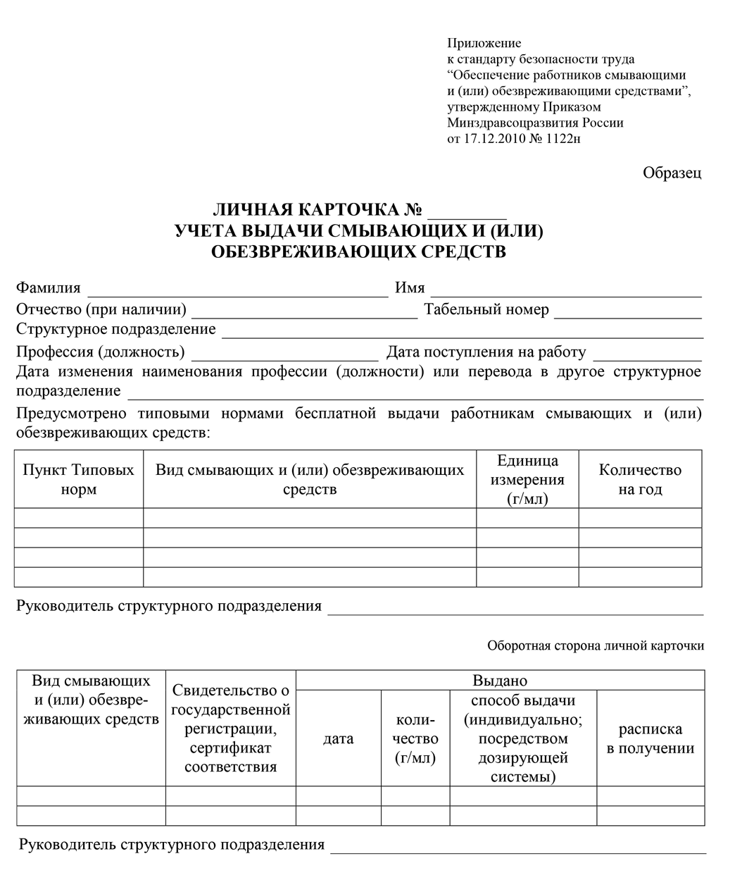 Личная карточка учета выдачи смывающих средств