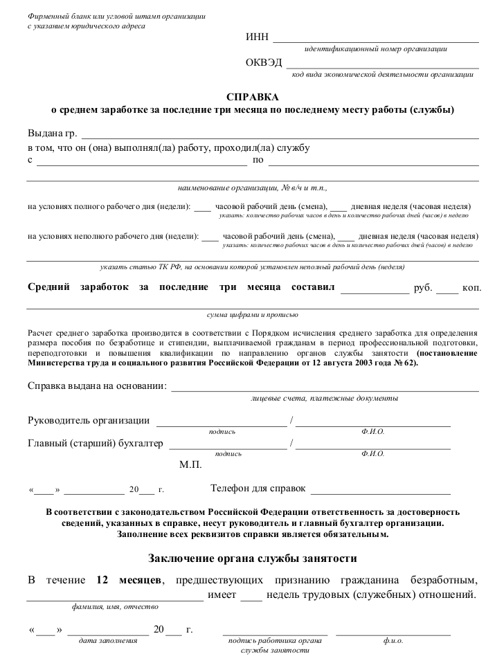 Справка о сумме среднего заработка за последние три месяца (в центр занятости)