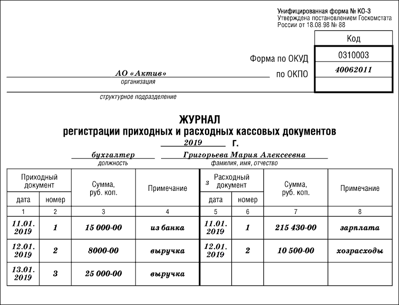 Журнал регистрации приходных и расходных кассовых документов (форма № КО-3)