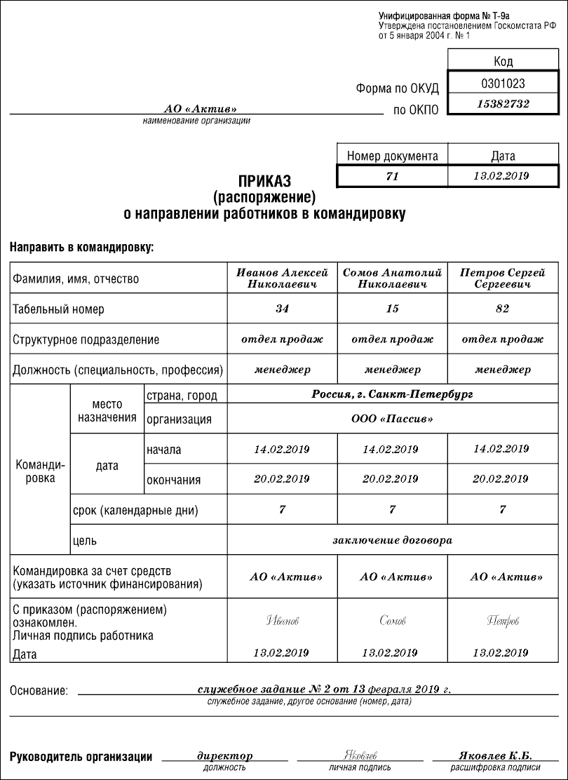 Приказ (распоряжение) о направлении работников в командировку (форма № Т-9а)