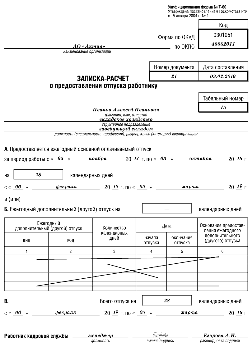 Записка-расчет о предоставлении отпуска работнику (форма № Т-60)