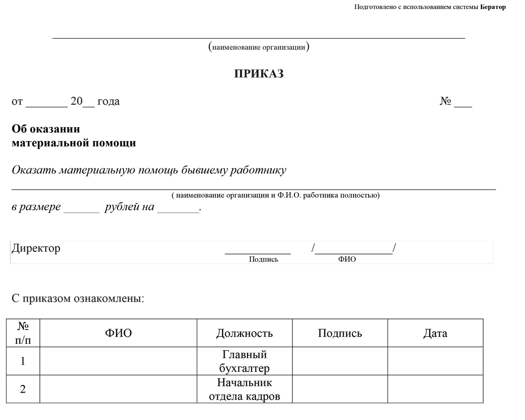 Приказ о выплате материальной помощи