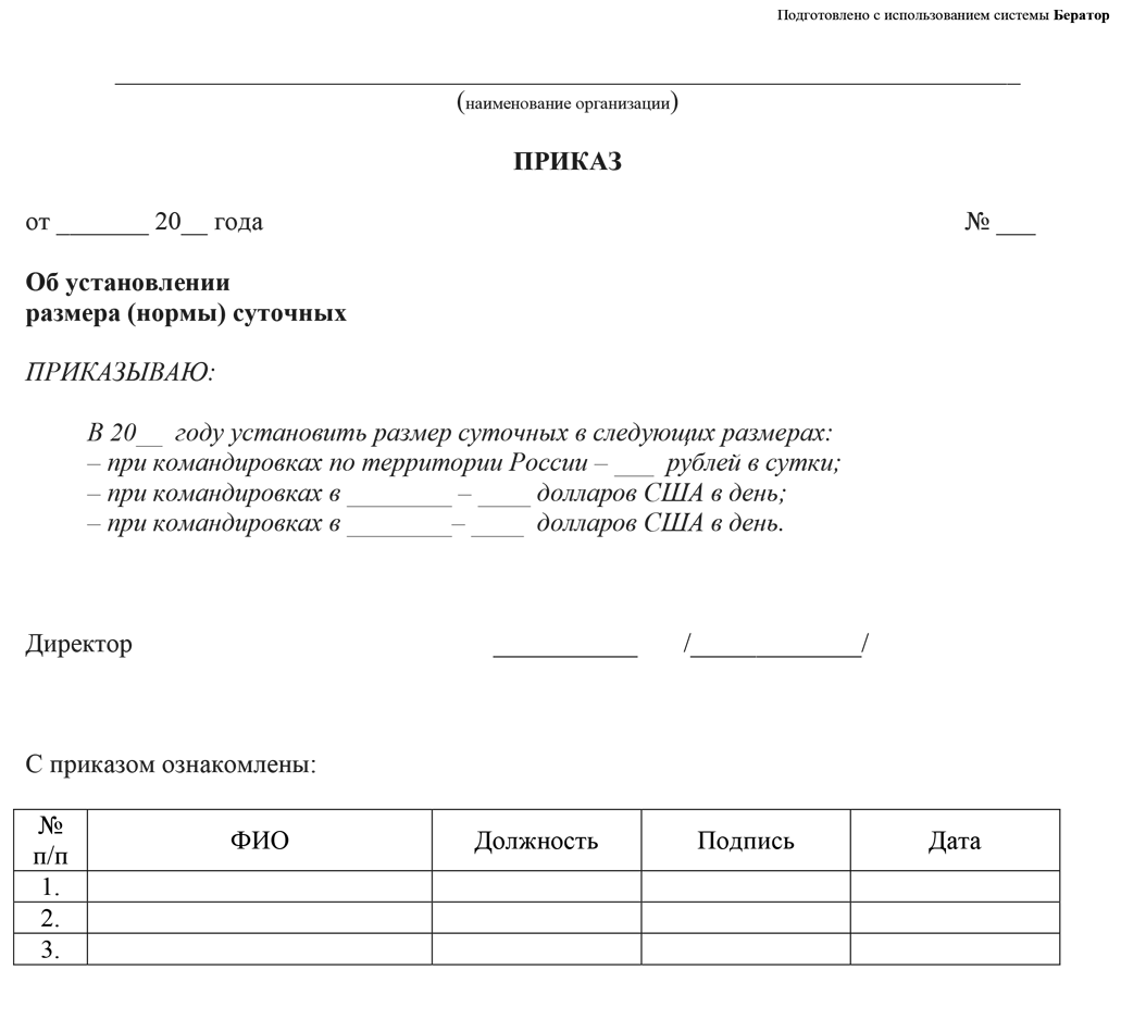 Приказ об установлении размера (нормы) суточных
