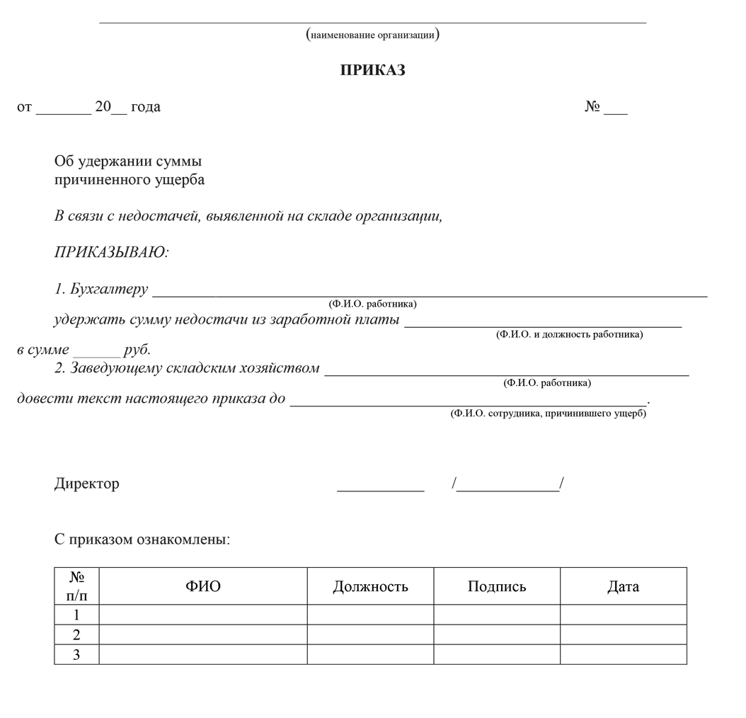 Приказ об удержании суммы причиненного ущерба организации
