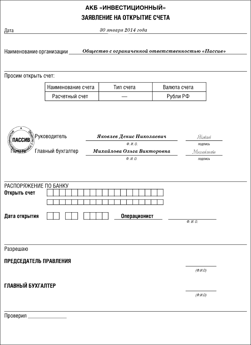 Заявление на открытие расчетного счета