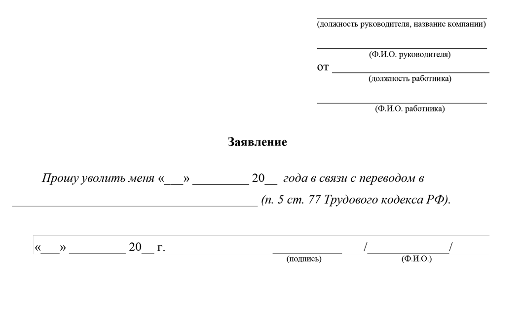 Заявление на увольнение в связи с переводом